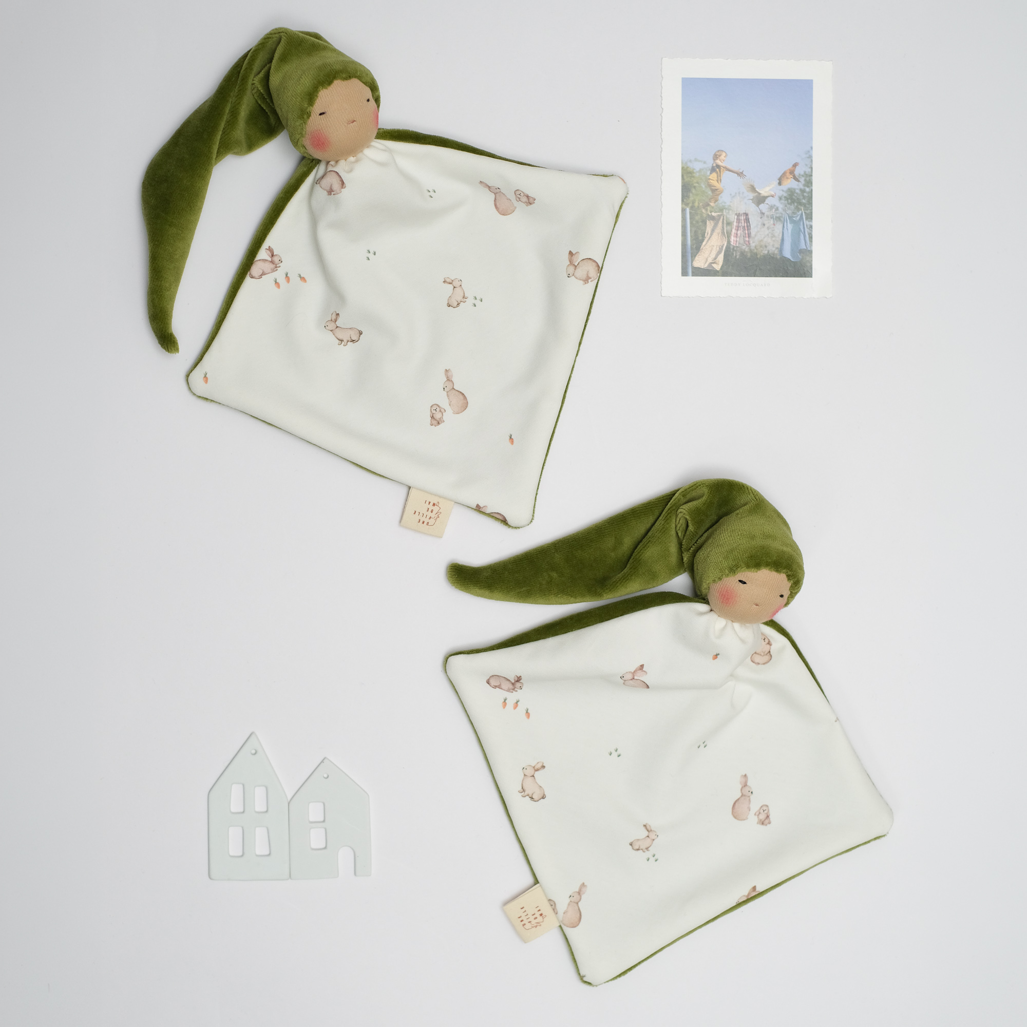 Son corps rectangulaire et léger se glisse naturellement entre les petits doigts qui explorent, tandis que son long bonnet, imaginé pour accueillir une tétine, mêle praticité et délicatesse avec beaucoup d’élégance.
