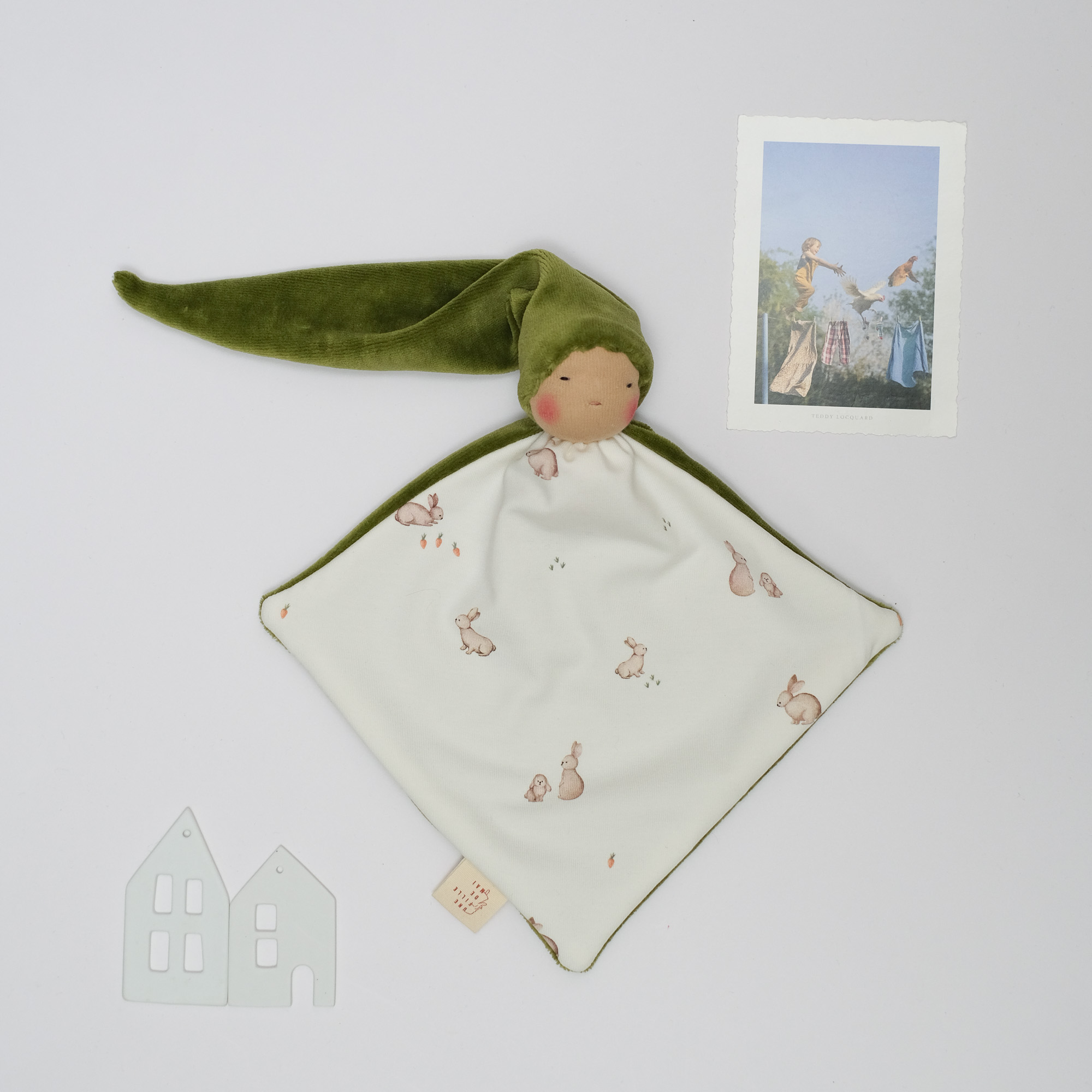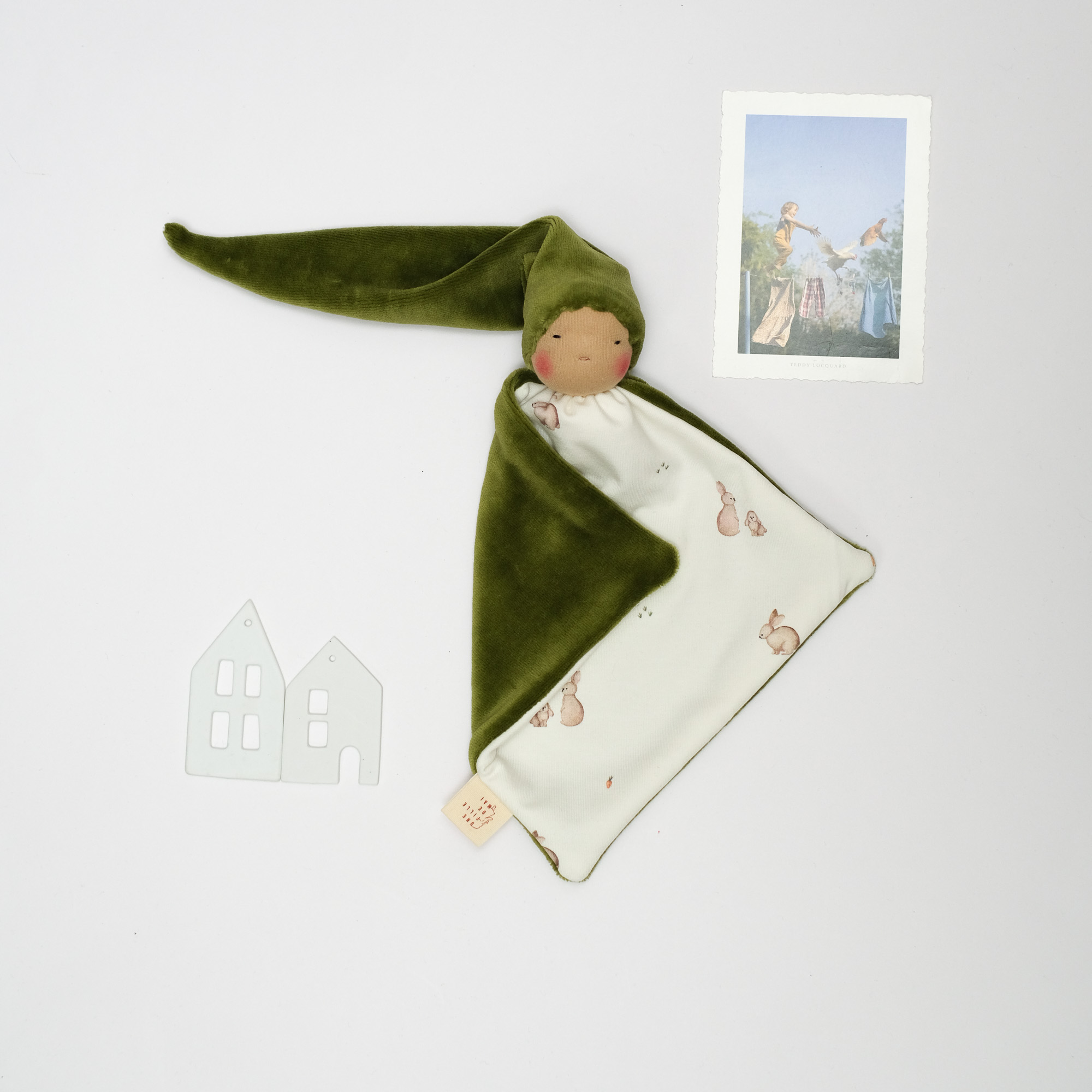 Doudou d’inspiration Waldorf, dimensions pensées pour les petites mains (environ 25 cm hors bonnet).